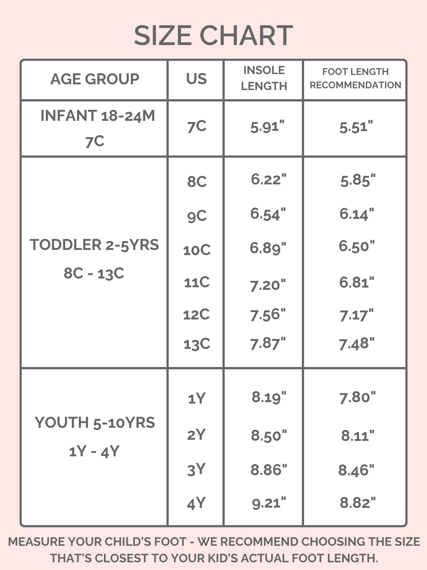 * Fit: For best fit, measure your child's foot from heel to length of the longest toe. Our size guide shows the best size according to your child's foot length. If they are between sizes, we recommend sizing up.